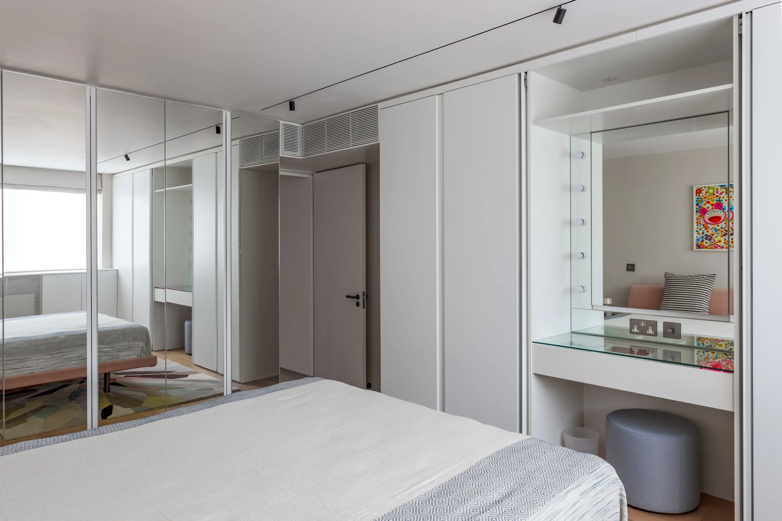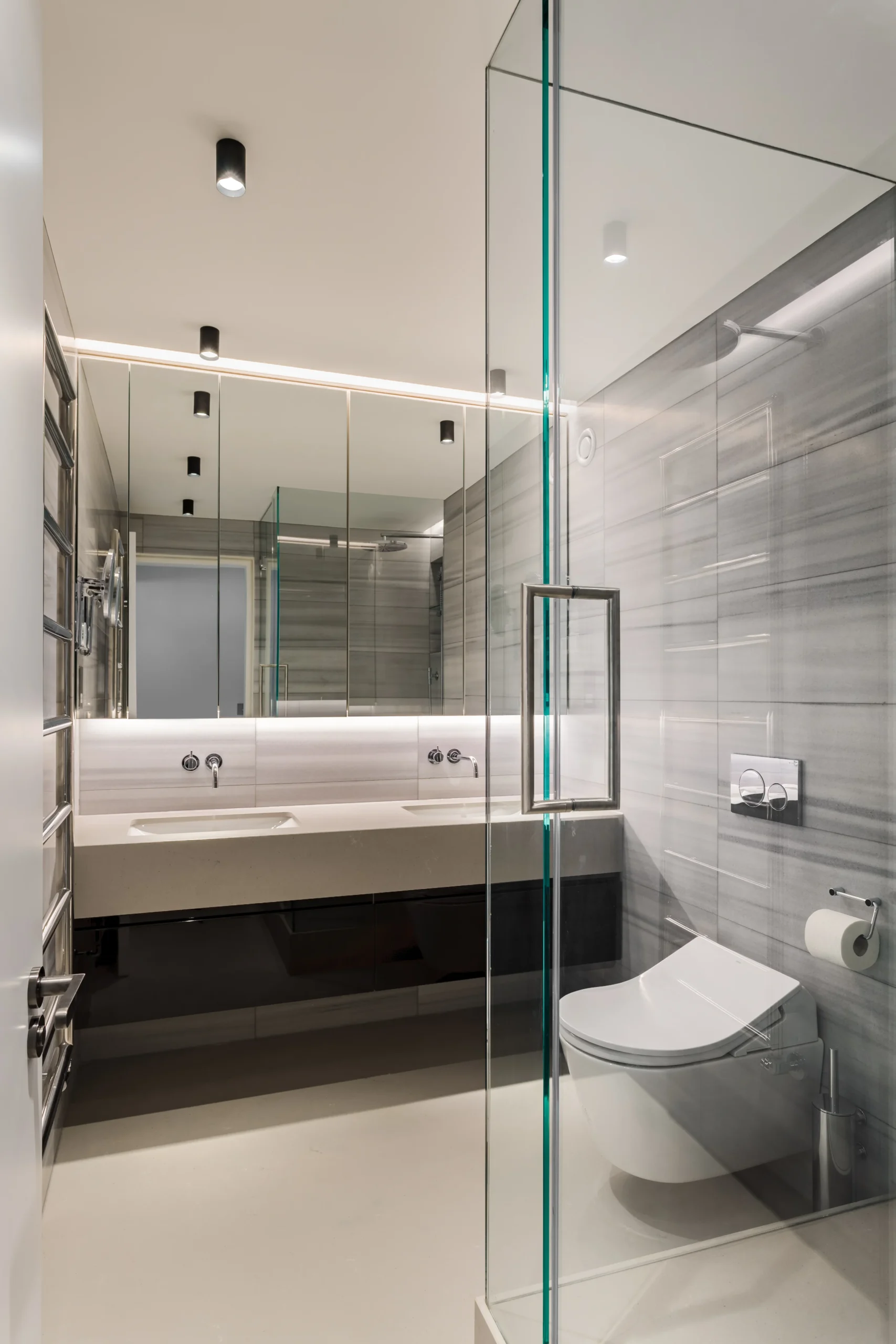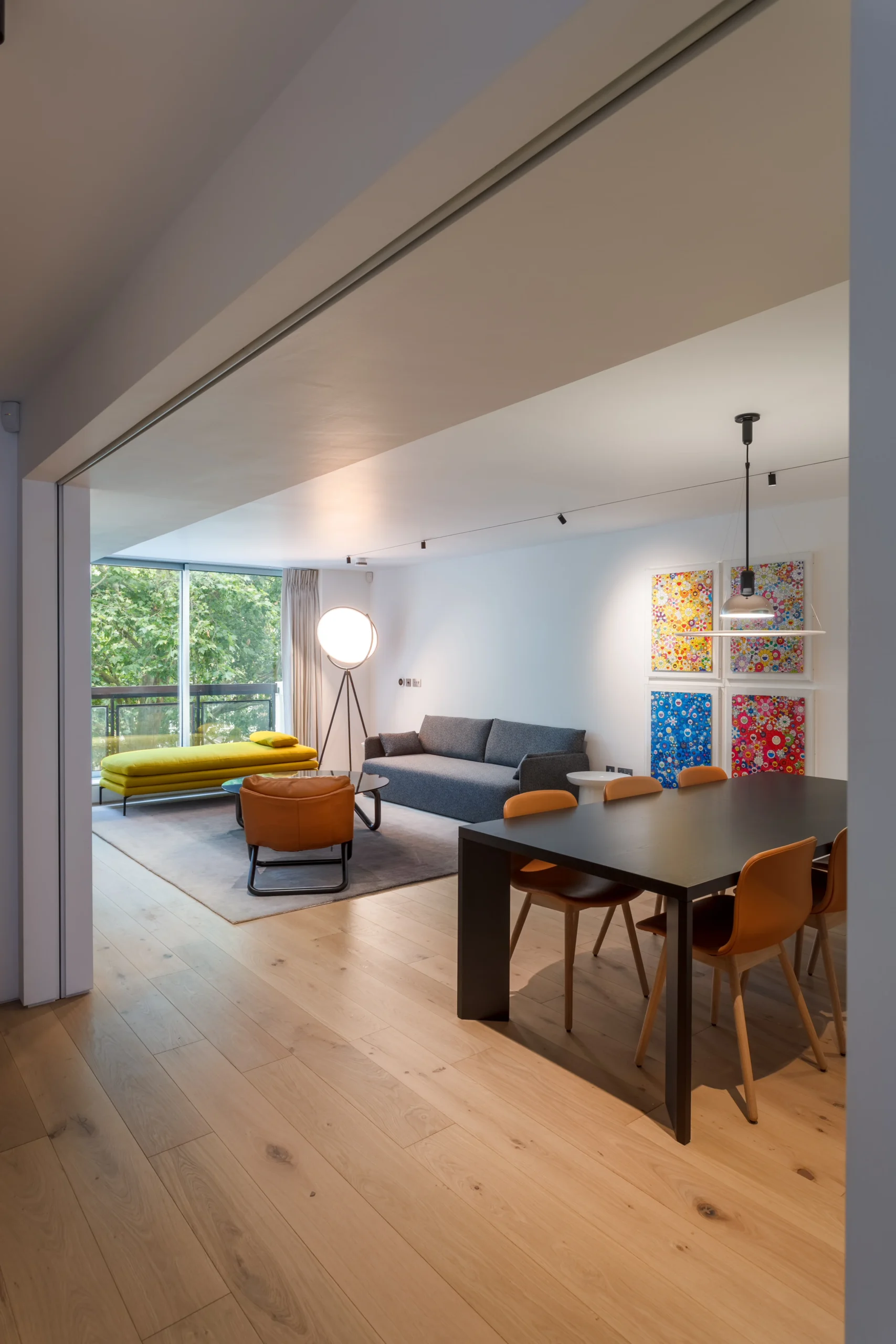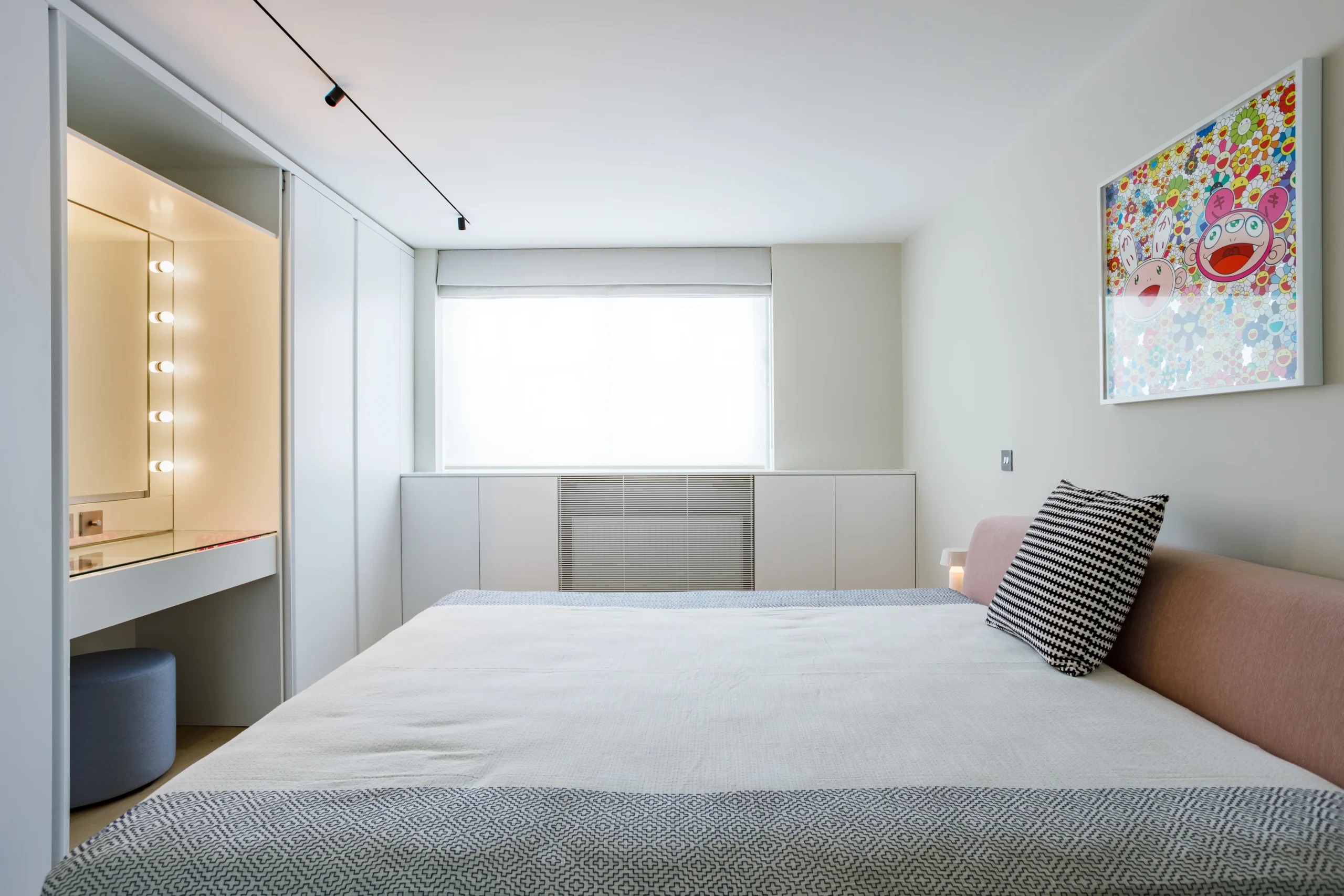 The living areas have been reimagined with bespoke wooden joinery, introducing both functionality and texture. These tailored elements provide smart storage solutions while infusing the interiors with a natural warmth that complements the clean architectural lines. Throughout the flat, the design thoughtfully merges contemporary aesthetics with functional luxury. Careful attention to materiality, lighting, and flow ensures that each room offers both comfort and style, reflecting the needs of modern city living while adding a layer of individuality. The result is a home that feels dynamic, welcoming, and distinctly personal.