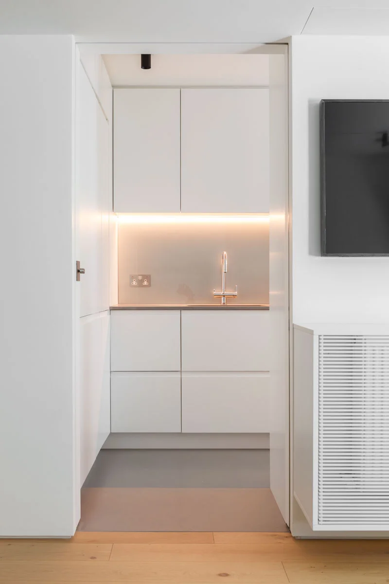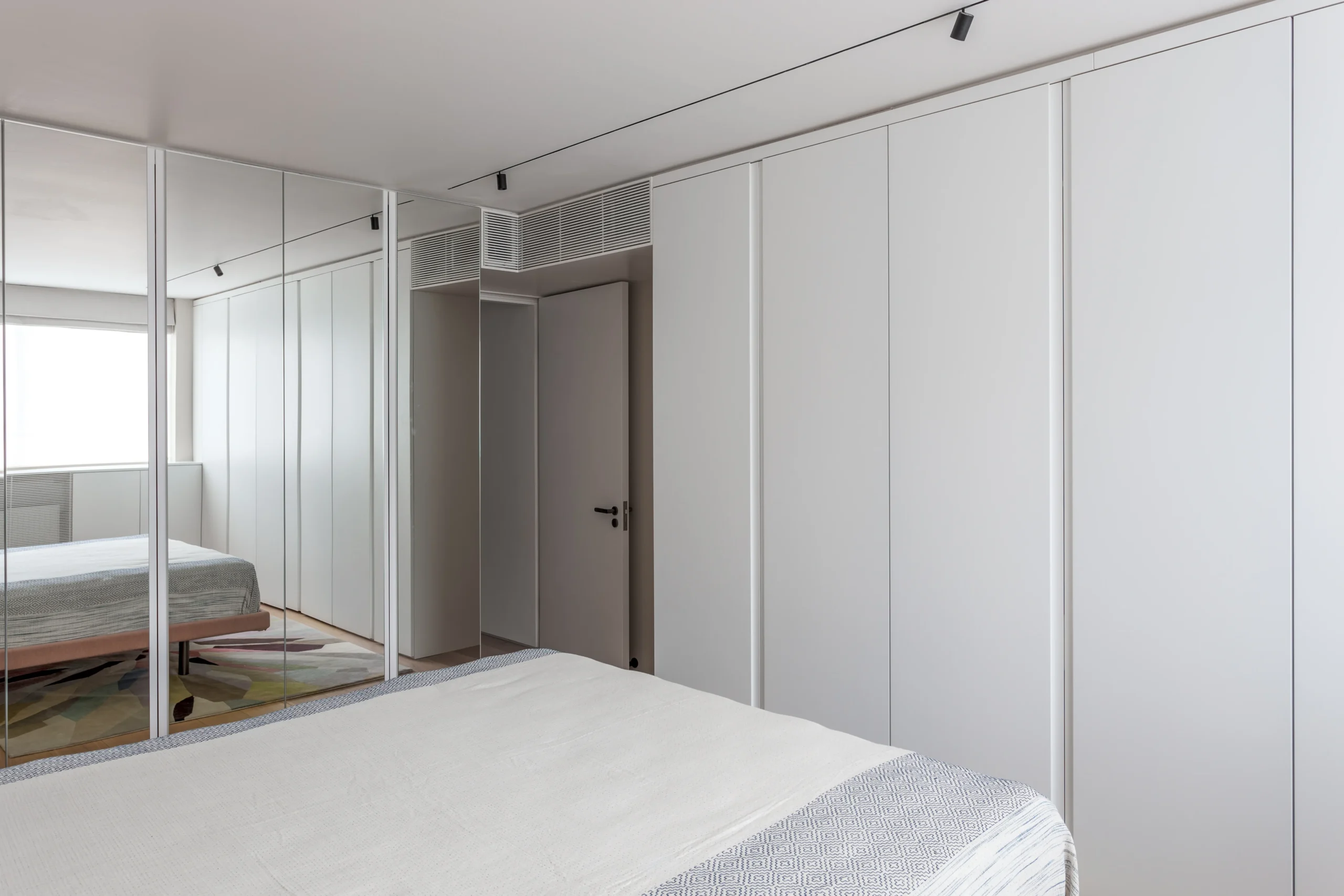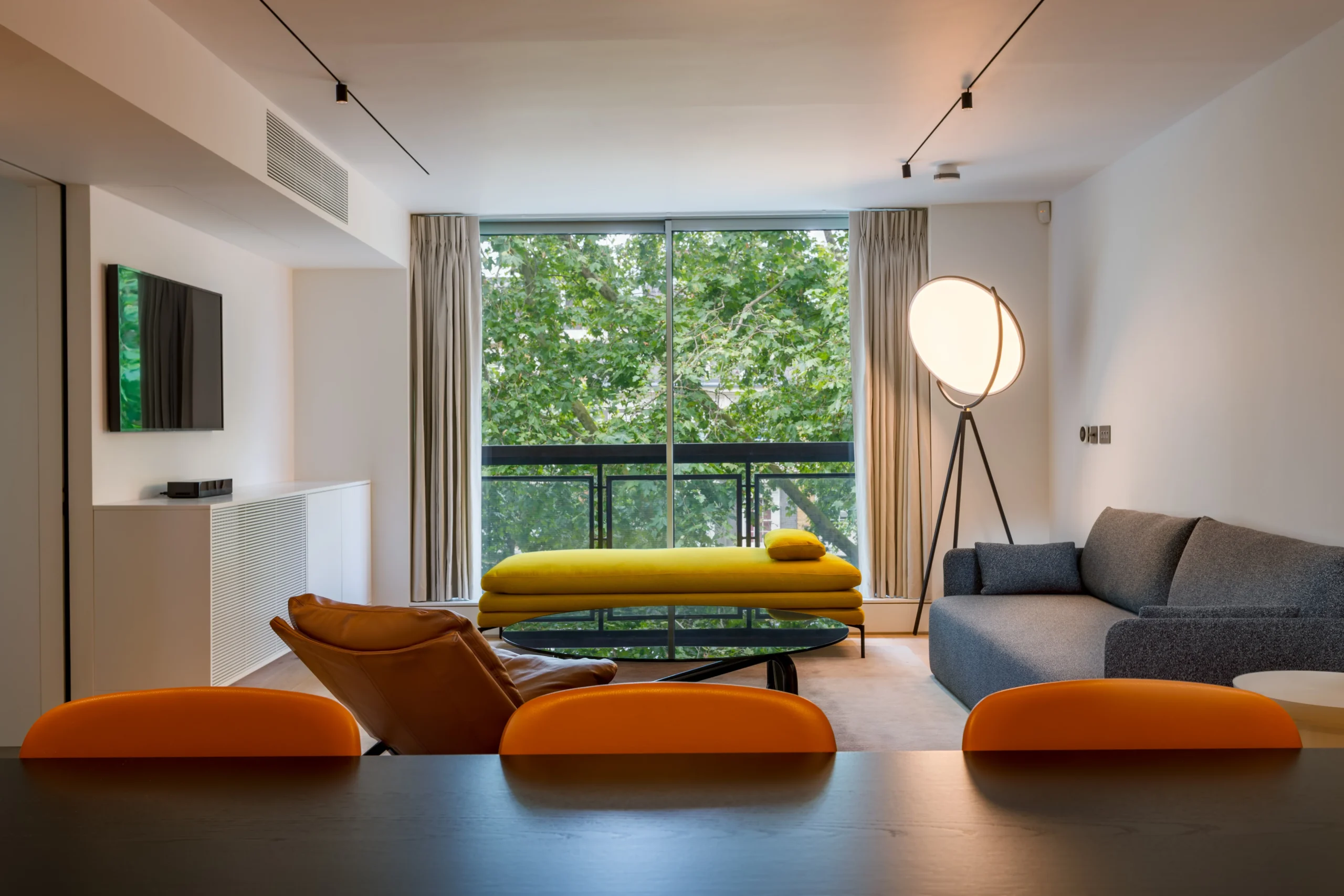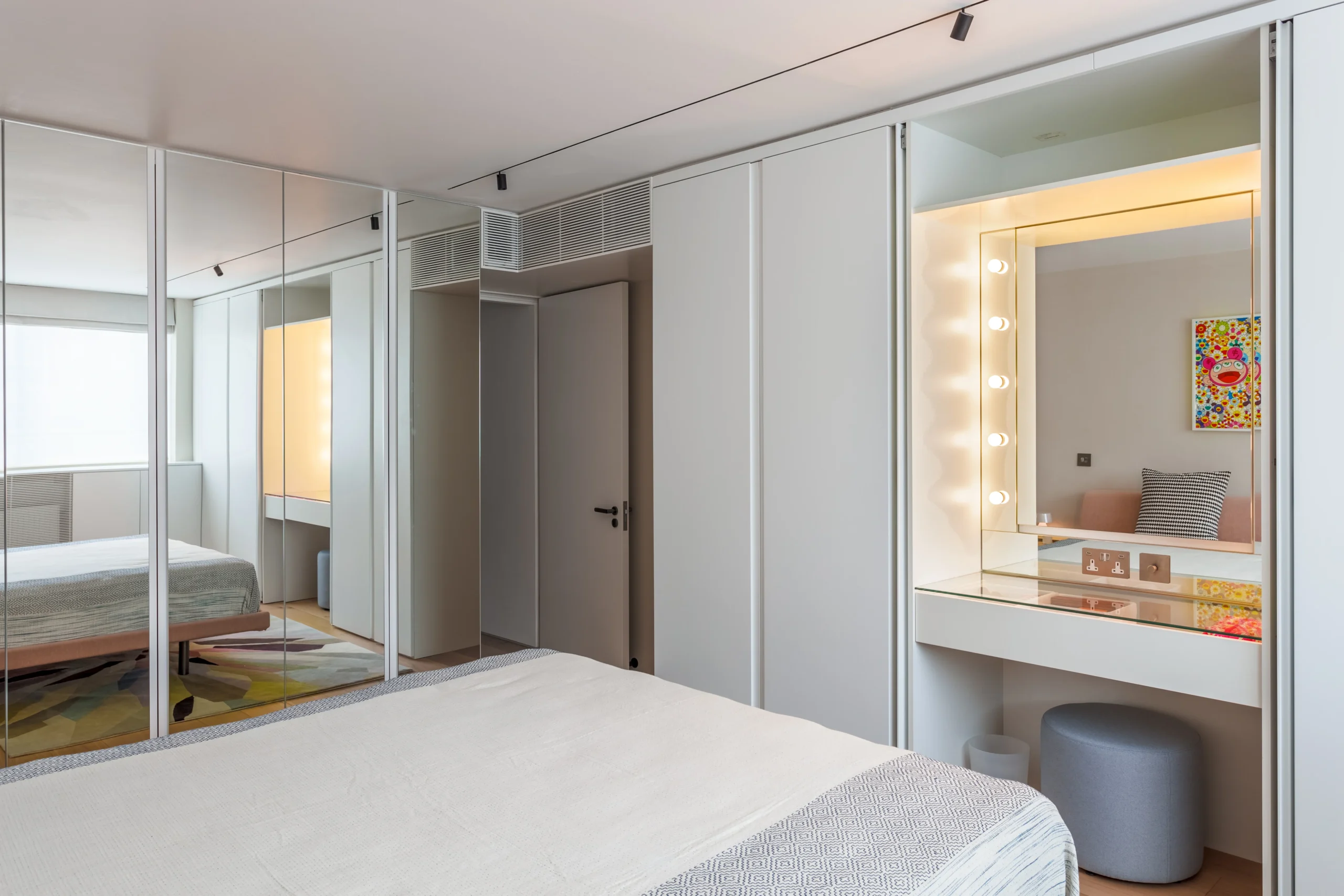 The living areas have been reimagined with bespoke wooden joinery, introducing both functionality and texture. These tailored elements provide smart storage solutions while infusing the interiors with a natural warmth that complements the clean architectural lines. Throughout the flat, the design thoughtfully merges contemporary aesthetics with functional luxury. Careful attention to materiality, lighting, and flow ensures that each room offers both comfort and style, reflecting the needs of modern city living while adding a layer of individuality. The result is a home that feels dynamic, welcoming, and distinctly personal.