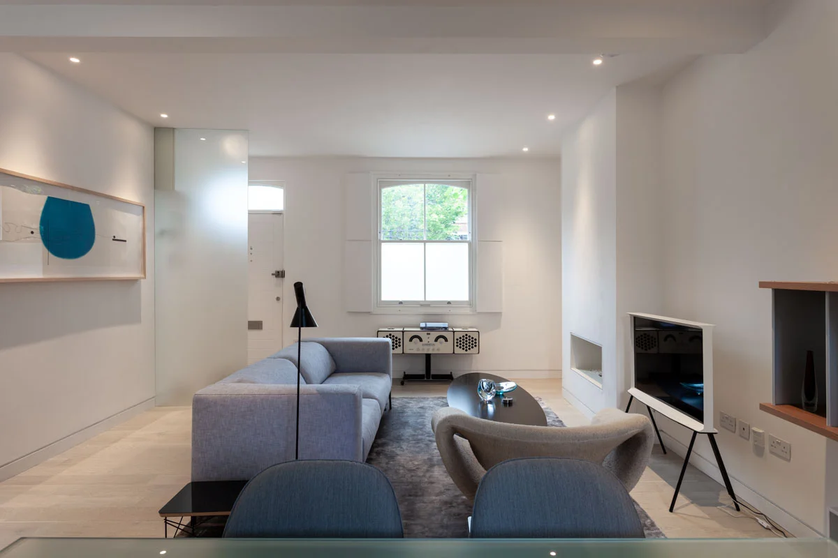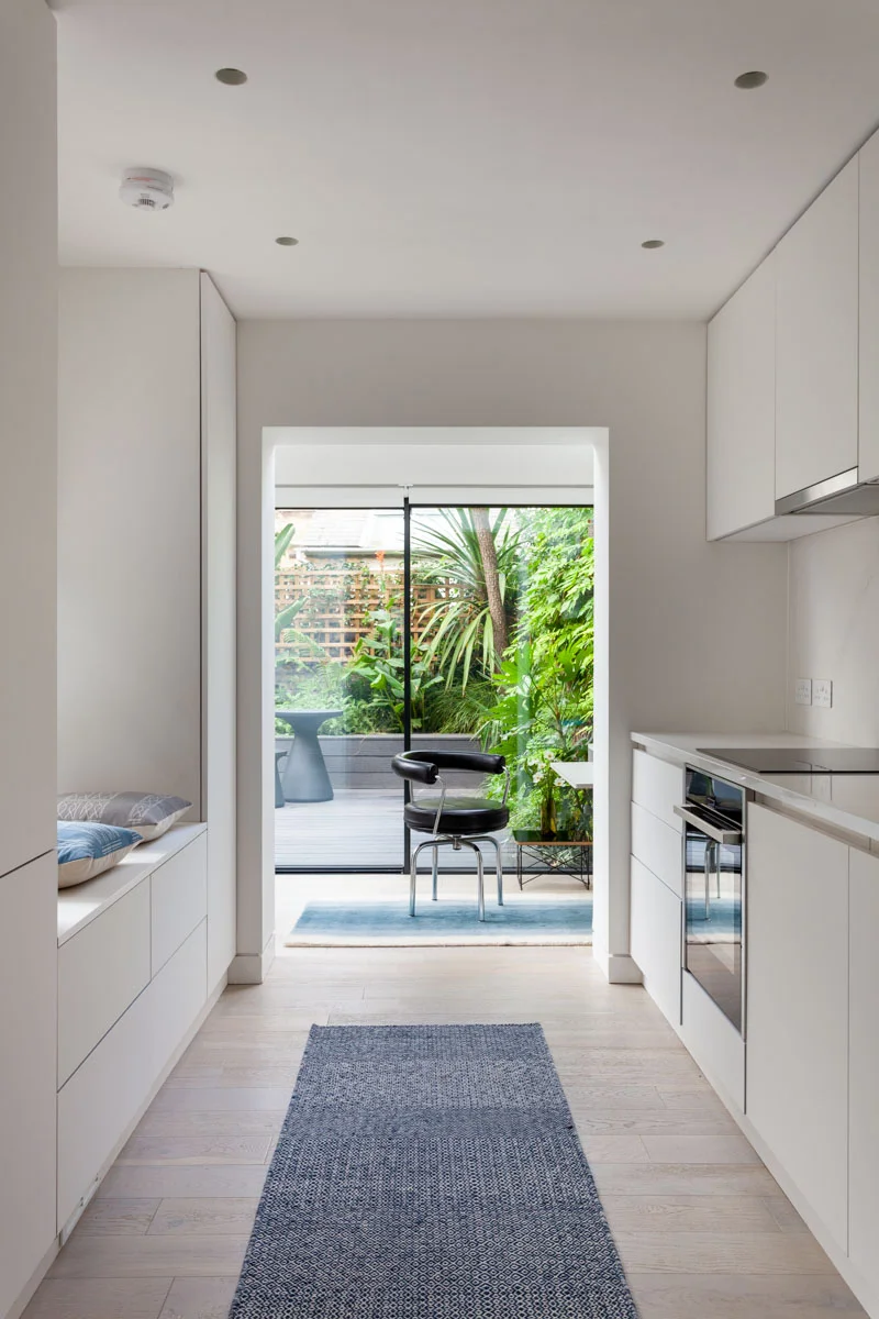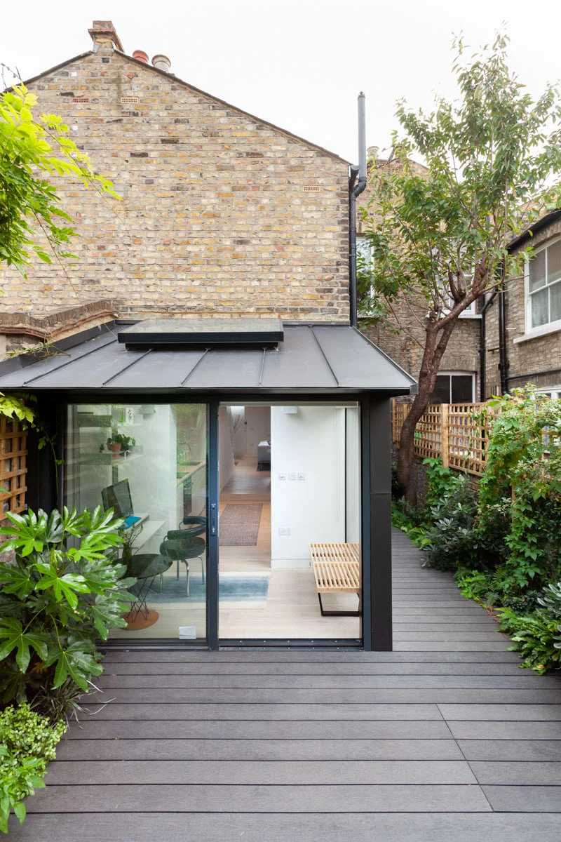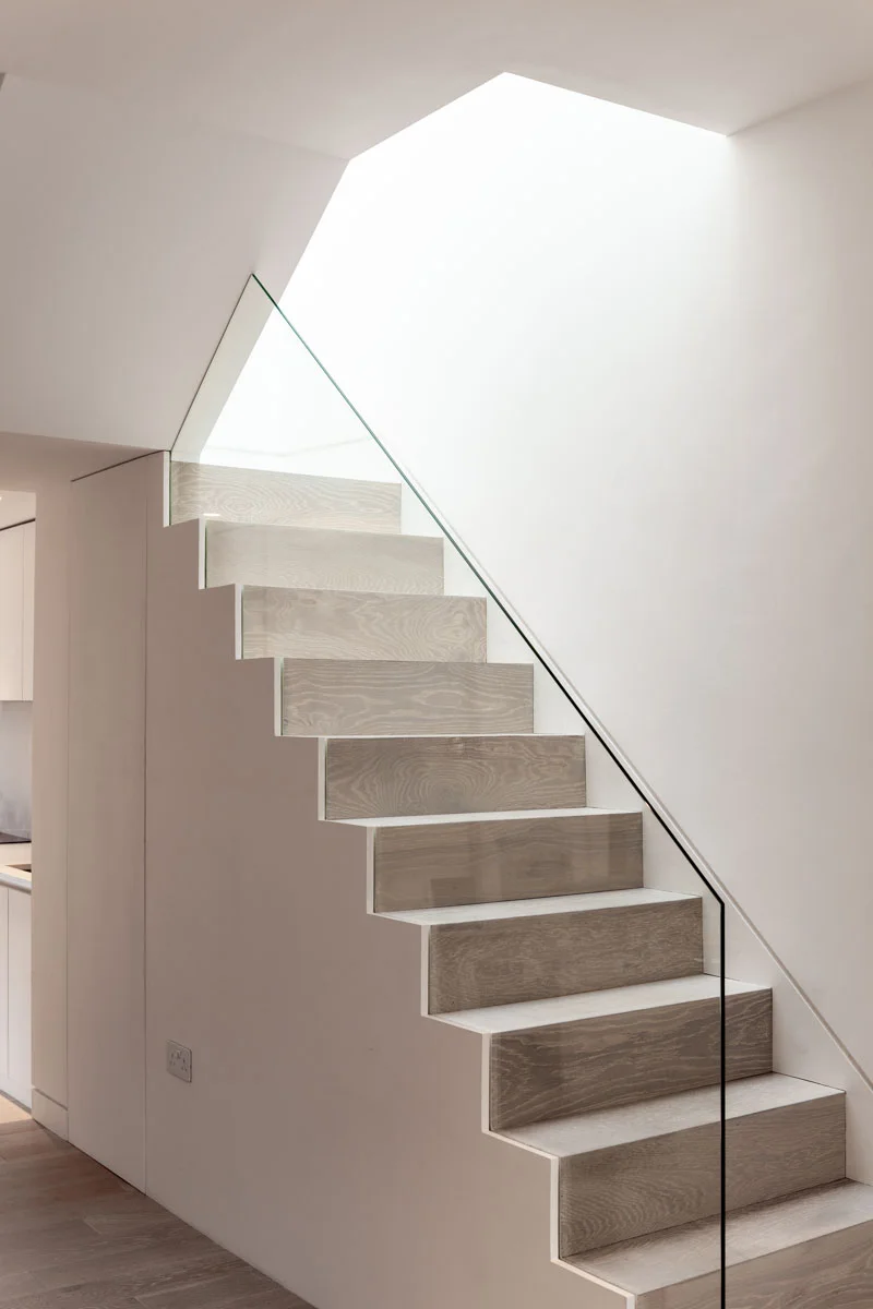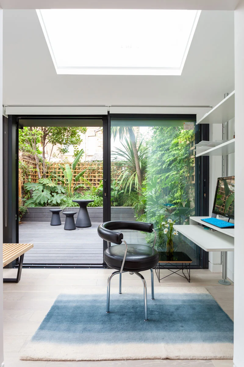 A fluid open space in a 19th century terrace house. Maximise the sense of space and light. The client brief here was to create an environment of spatial clarity and visual calm while incorporating functionality. A new skylight has been added over the staircase to allow light to flood this previously dark zone. At the rear of the house a new conservatory extension was added as a place to study and work and observe the greenery of the East London yard. Upstairs a large white mosaic tiled bathroom with marble wall panels and a free standing bath continues the sense of calm but with a bit of luxury in the busy city.