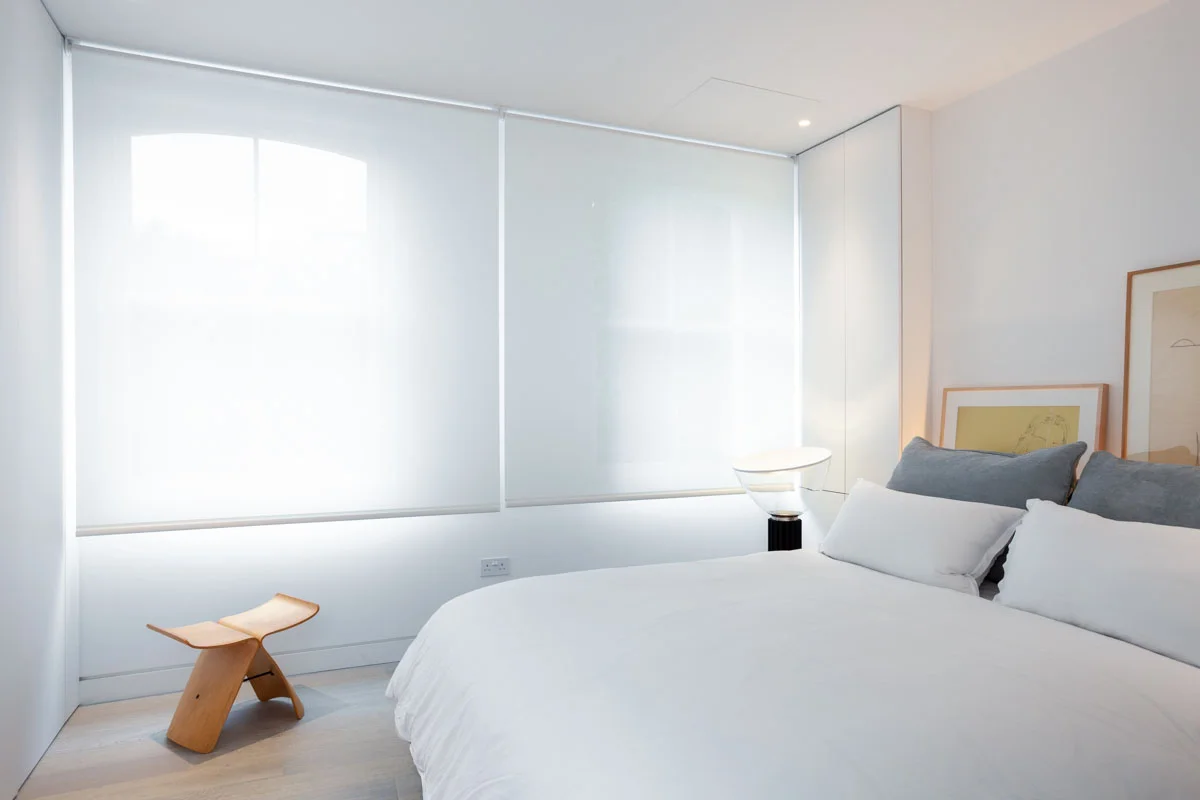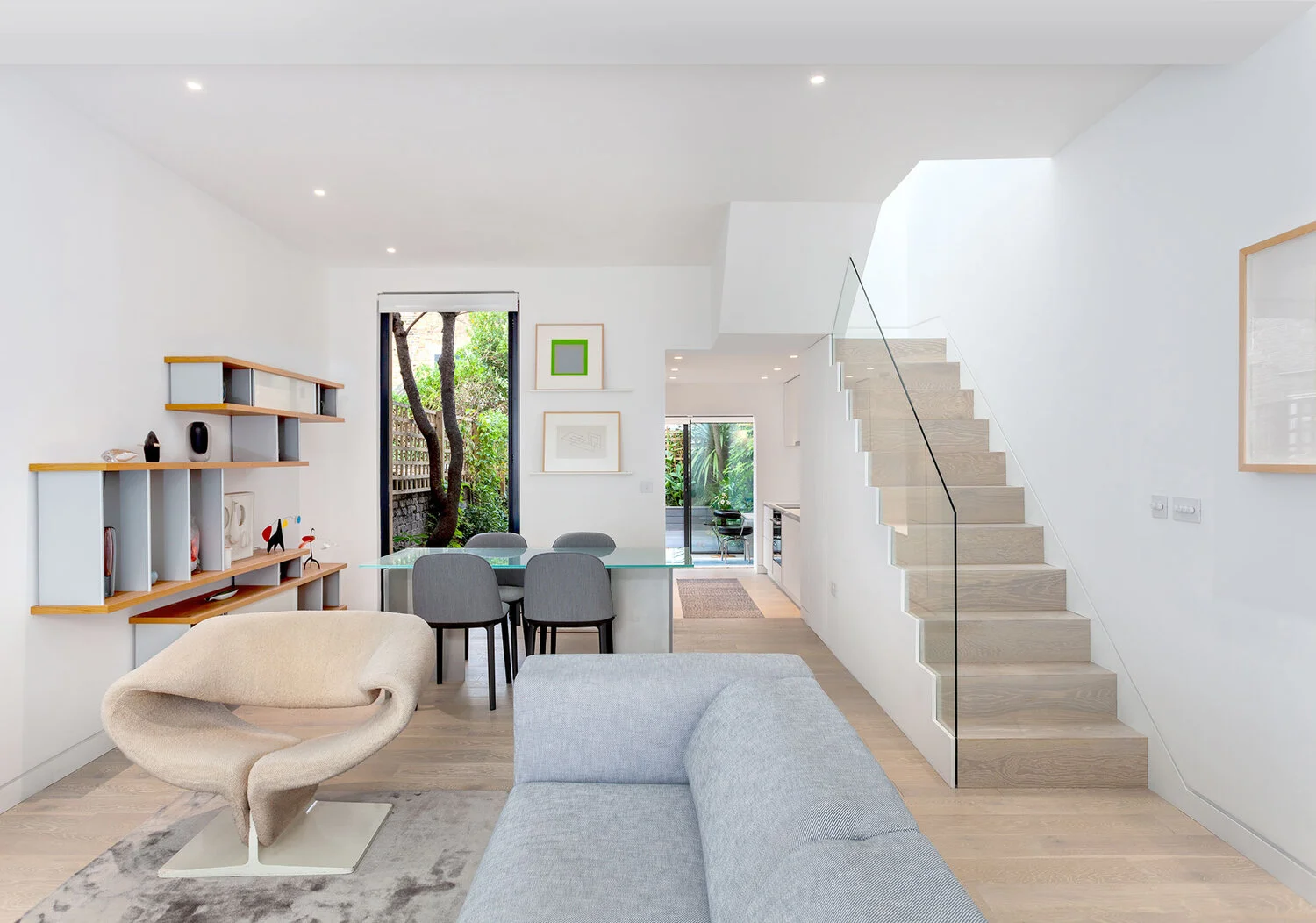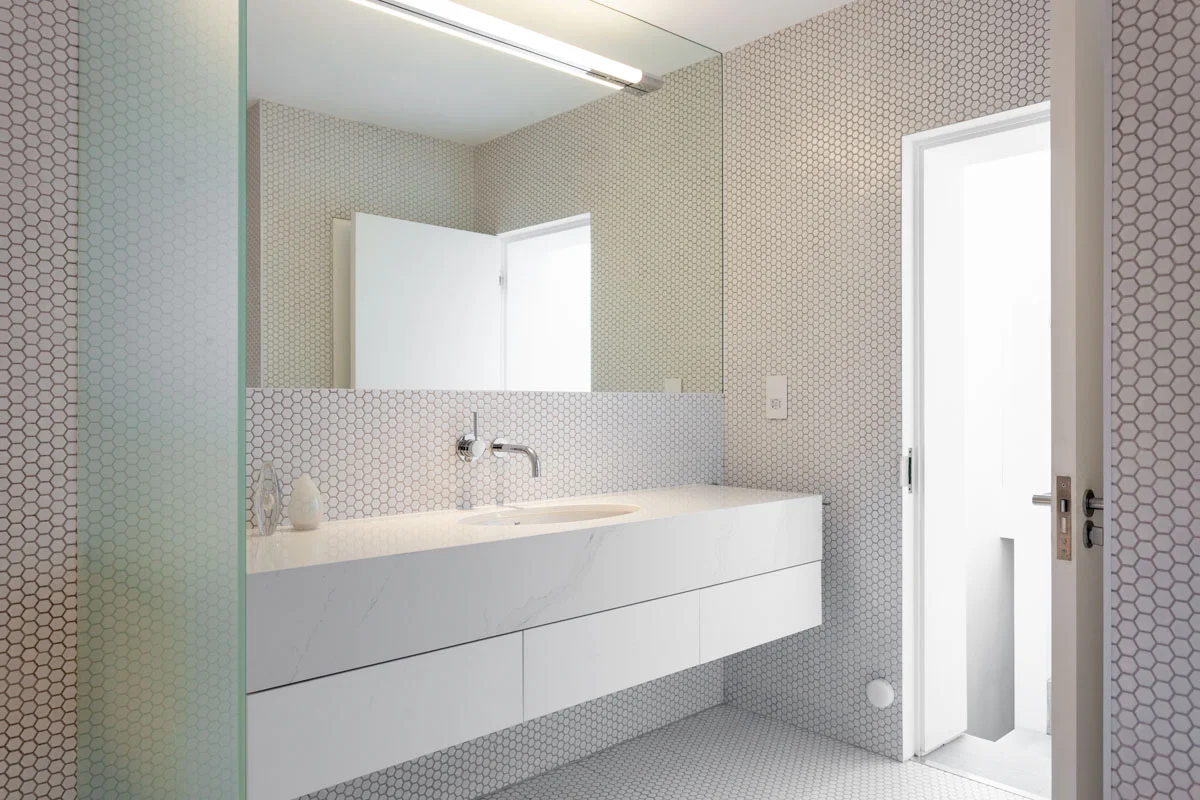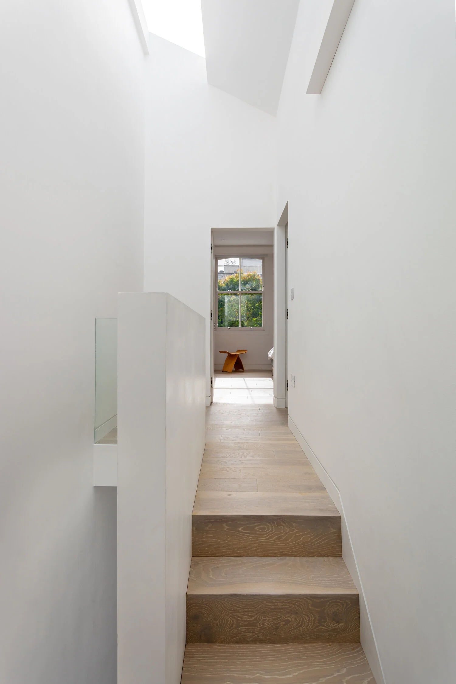 A fluid open space in a 19th century terrace house. Maximise the sense of space and light. The client brief here was to create an environment of spatial clarity and visual calm while incorporating functionality. A new skylight has been added over the staircase to allow light to flood this previously dark zone. At the rear of the house a new conservatory extension was added as a place to study and work and observe the greenery of the East London yard. Upstairs a large white mosaic tiled bathroom with marble wall panels and a free standing bath continues the sense of calm but with a bit of luxury in the busy city.